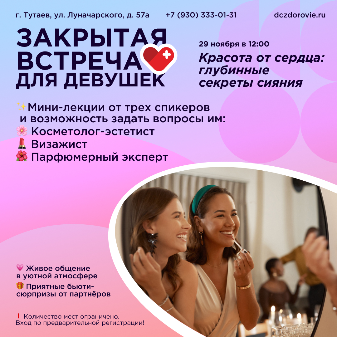 29 ноября в ДЦ «Здоровье» состоится закрытая встреча «Красота от сердца: глубинные секреты сияния». Начало мероприятия — в 12:00, сбор гостей с 11:30. Это камерный формат для девушек, которые хотят глубже понять основы естественной красоты и ухода за собой.