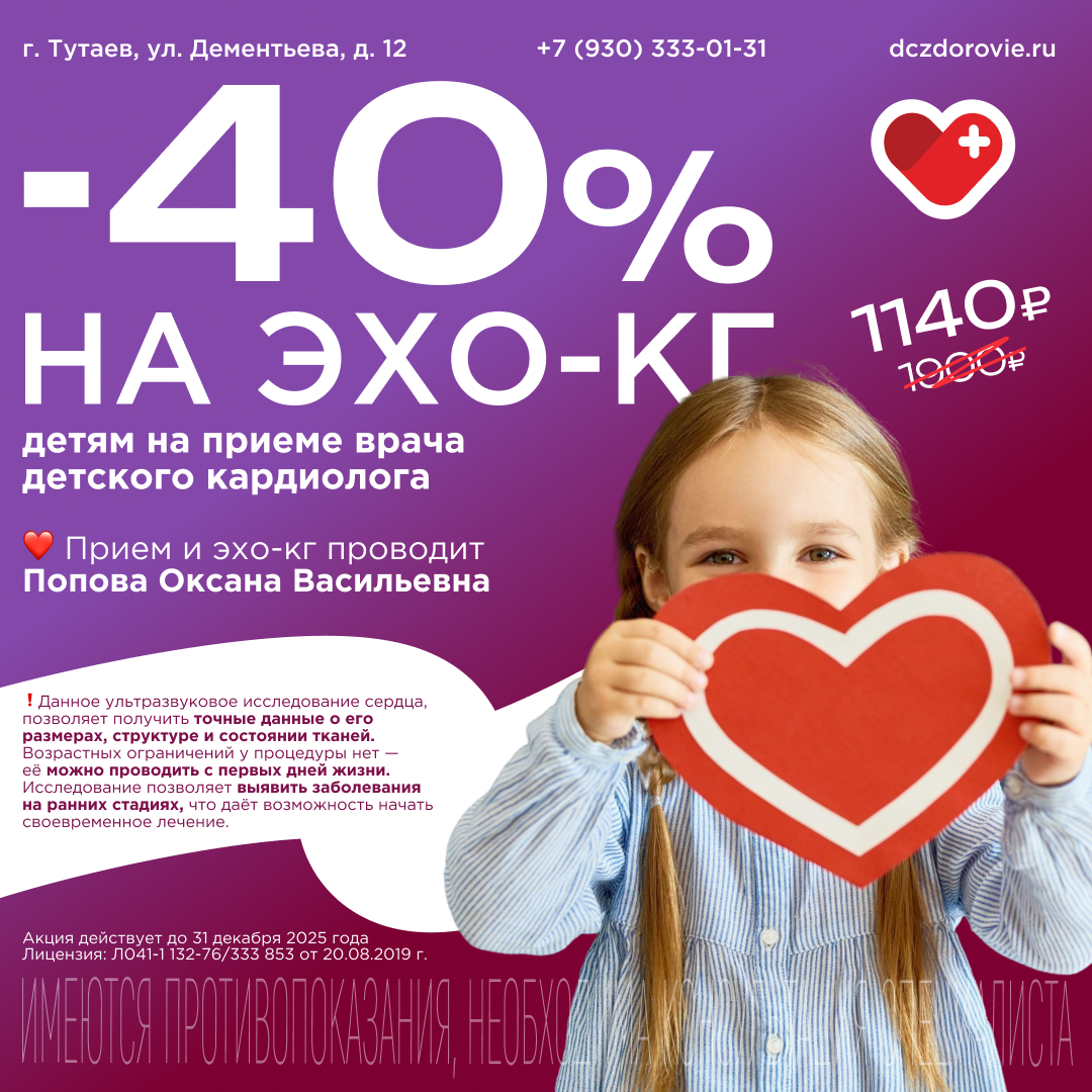 Здоровье сердца — фундамент активной и полноценной жизни каждого ребенка. В ДЦ «Здоровье» мы предлагаем родителям уникальную возможность провести ультразвуковое исследование сердца (ЭХО-КГ) со скидкой 40%! Выгода до 760 ₽ — это шанс получить профессиональную диагностику без переплат.