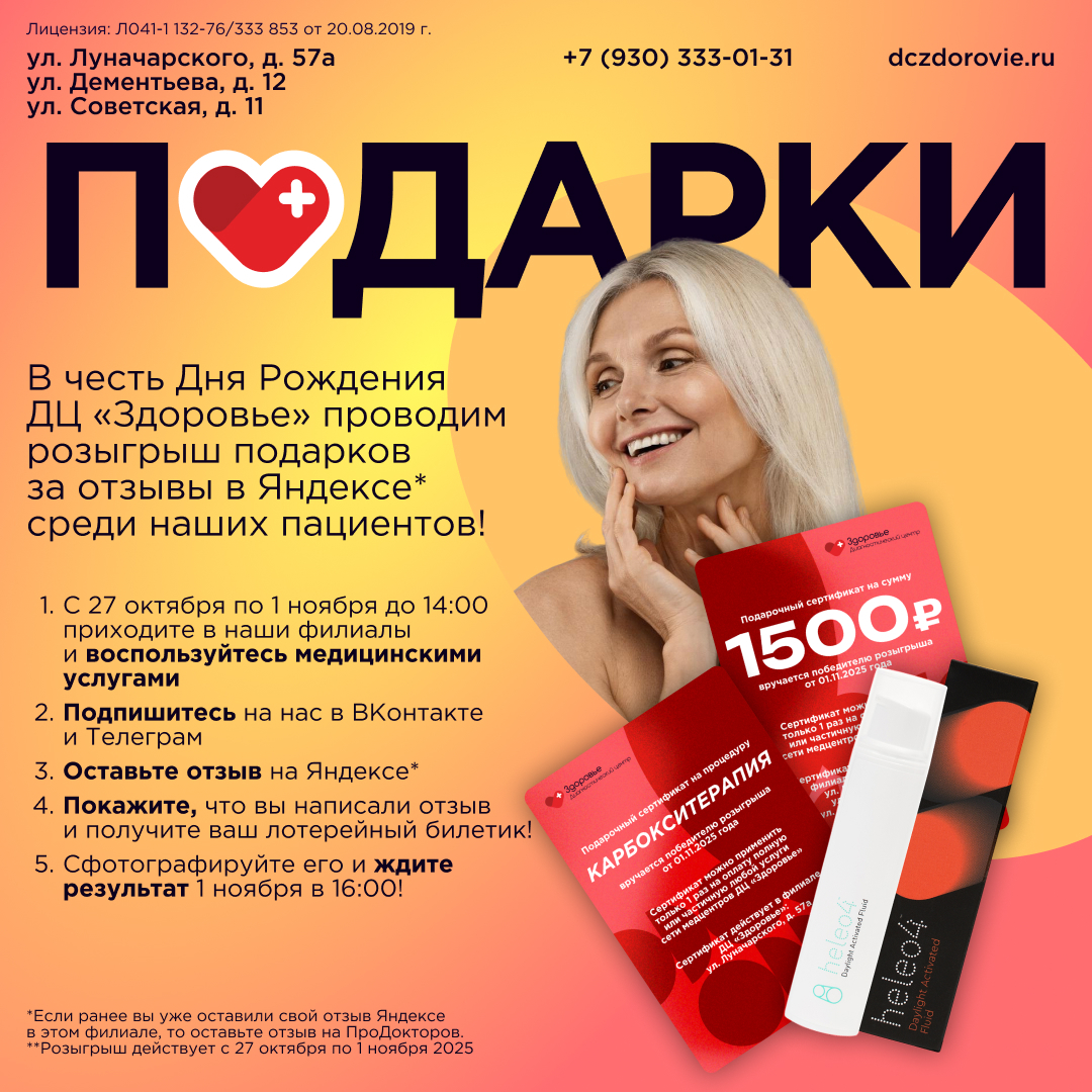 В честь Дня Рождения ДЦ «Здоровье» мы запускаем уникальную акцию: оставьте отзыв в Яндексе и получите шанс выиграть ценные призы! Это ваш шанс бесплатно попробовать наши услуги и поделиться впечатлениями.