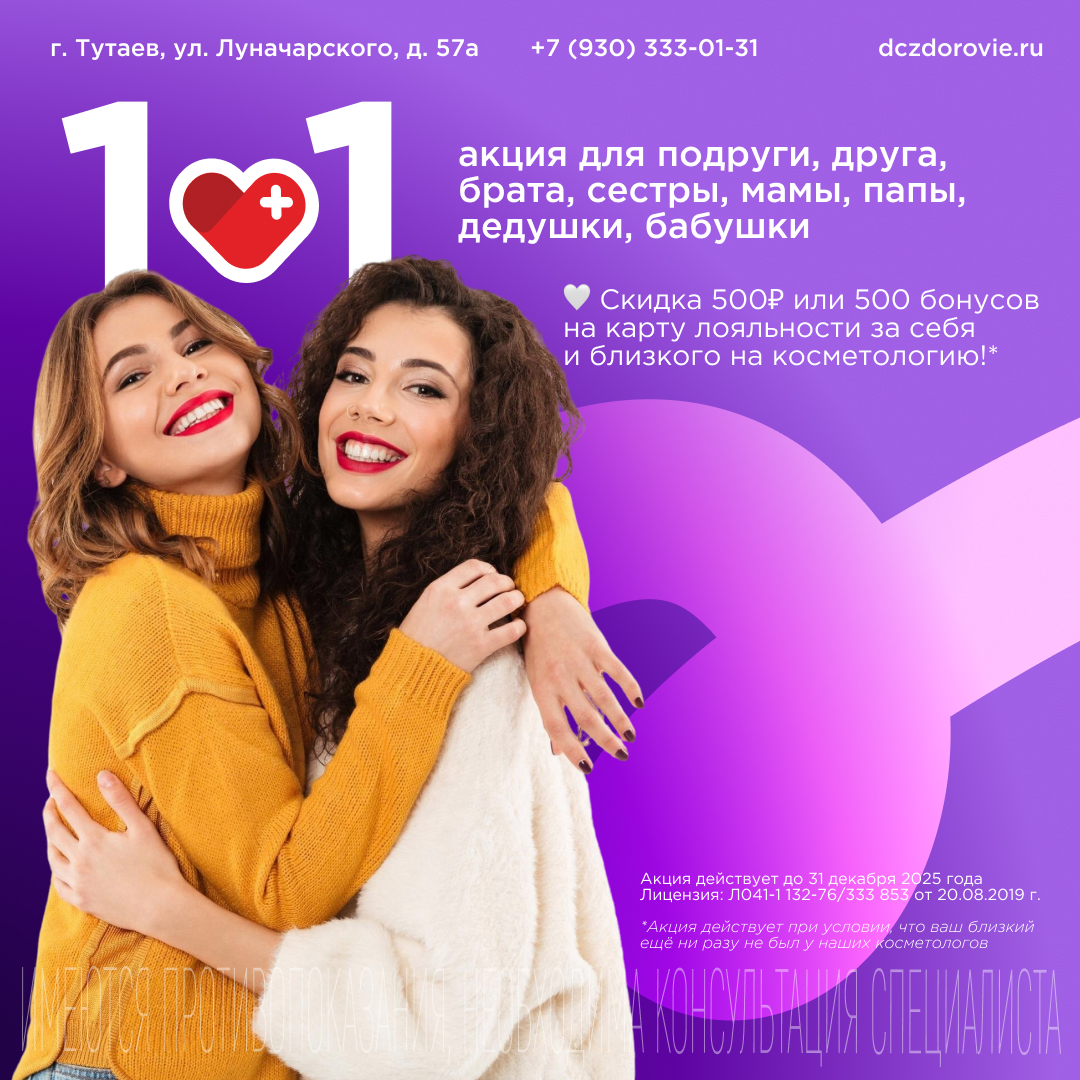 В ДЦ «Здоровье» стартовала выгодная акция «1+1», которая позволяет дарить красоту и получать выгоду вместе. Пригласите на косметологическую процедуру своего близкого — друга, маму, сестру, брата, коллегу или любого человека, который ещё ни разу не был у наших косметологов — и вы оба получите по 500 ₽.я
