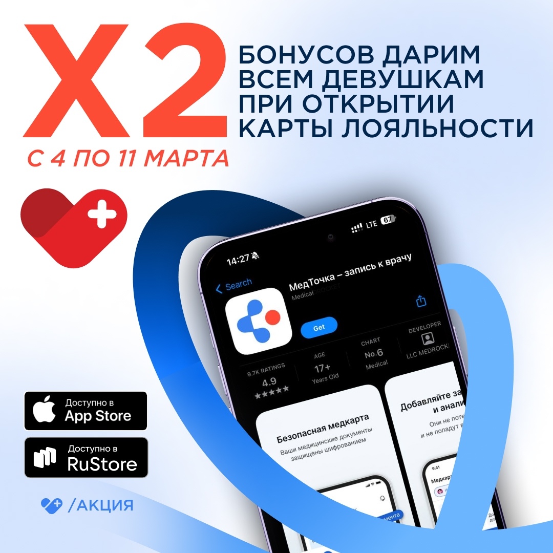Приходите в наши филиалы, оформляйте карту лояльности в приложении МедТочка. Предварительно скачайте себе приложение МедТочка.После оформления карты вам будет начислено 600 приветственных бонусов (1 бонус = 1 рублю), которые можно будет потратить на оплату услуг в нашем медцентре!